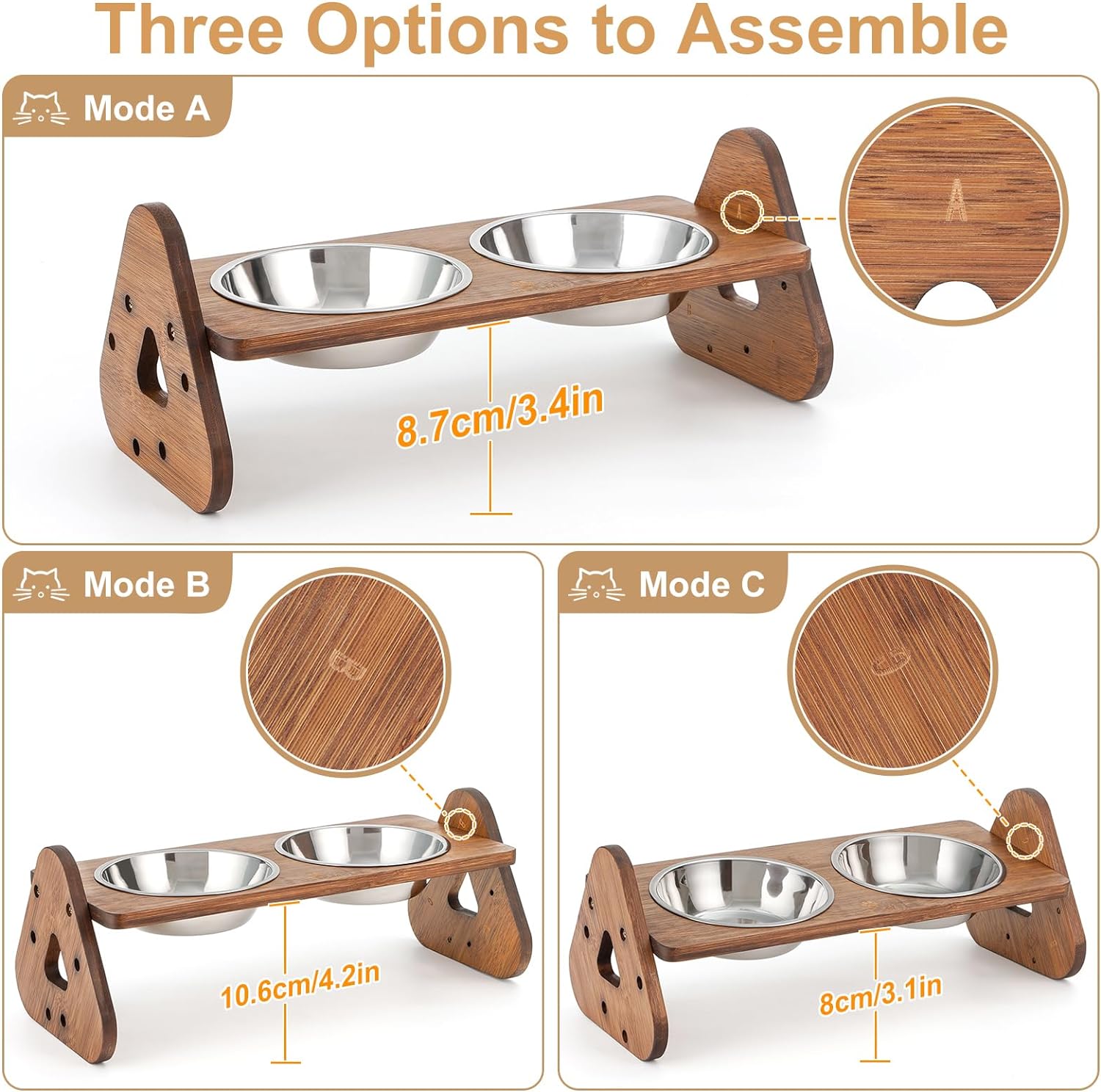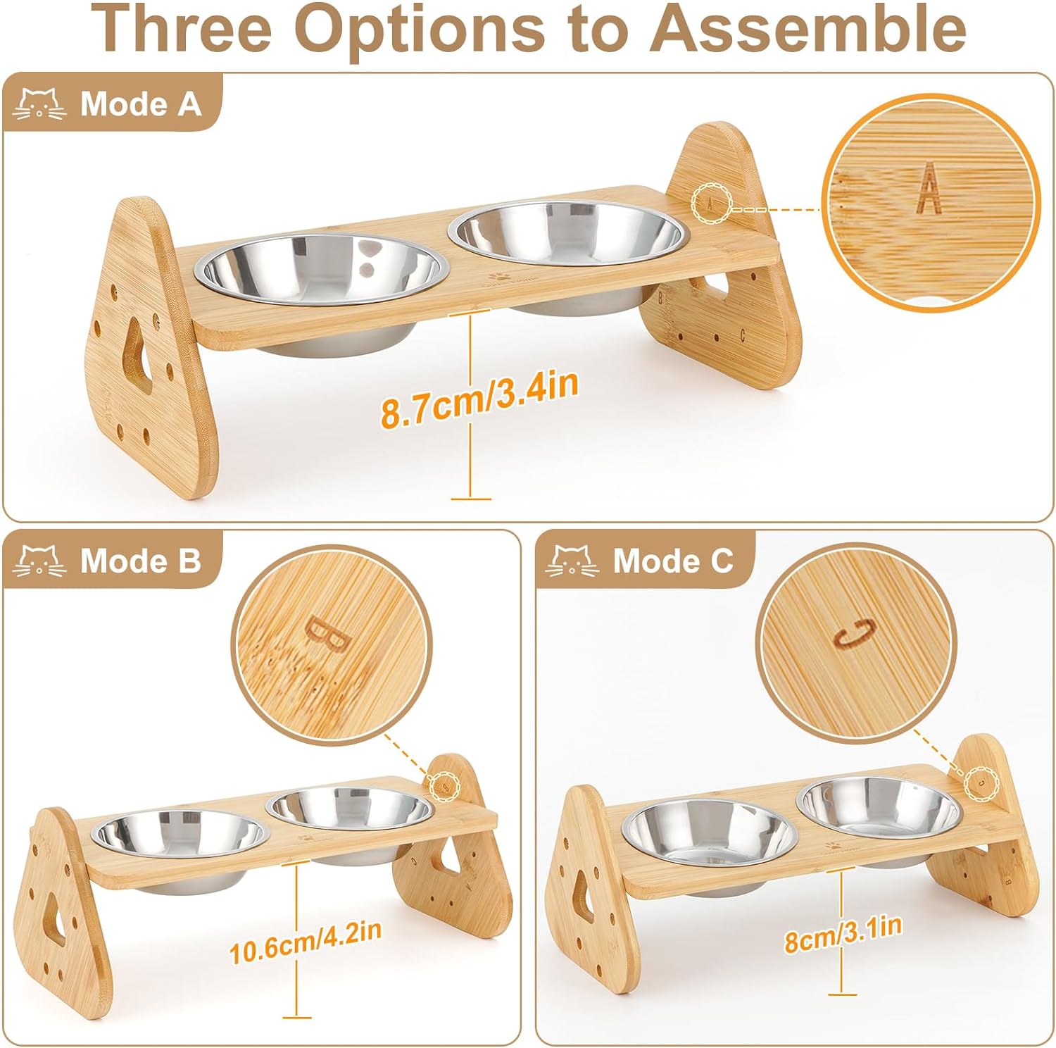 - 【Adjustable Design】This cat bowl has three different heights(8cm/3.1in, 8.7cm/3.4in, 10.6cm/4.2in) and can be set up flat or 8° tilted. You can simply adjust the height/angle by changing the way the side panels are assembled.