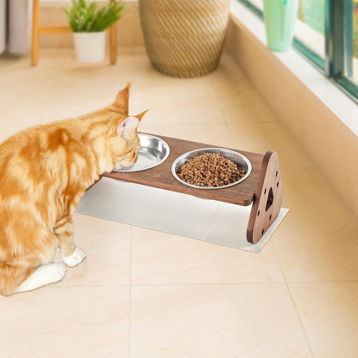- 【Durable Bamboo Frame】The frame of our cat bowl for indoor cats is made of bamboo, which has been polished and varnished, odorless and smooth. The triangular sides structure enhances the bowl's stability.(NOTE: bamboo products should not be exposed to constant wetness, so please wipe it dry in time if it gets wet!).