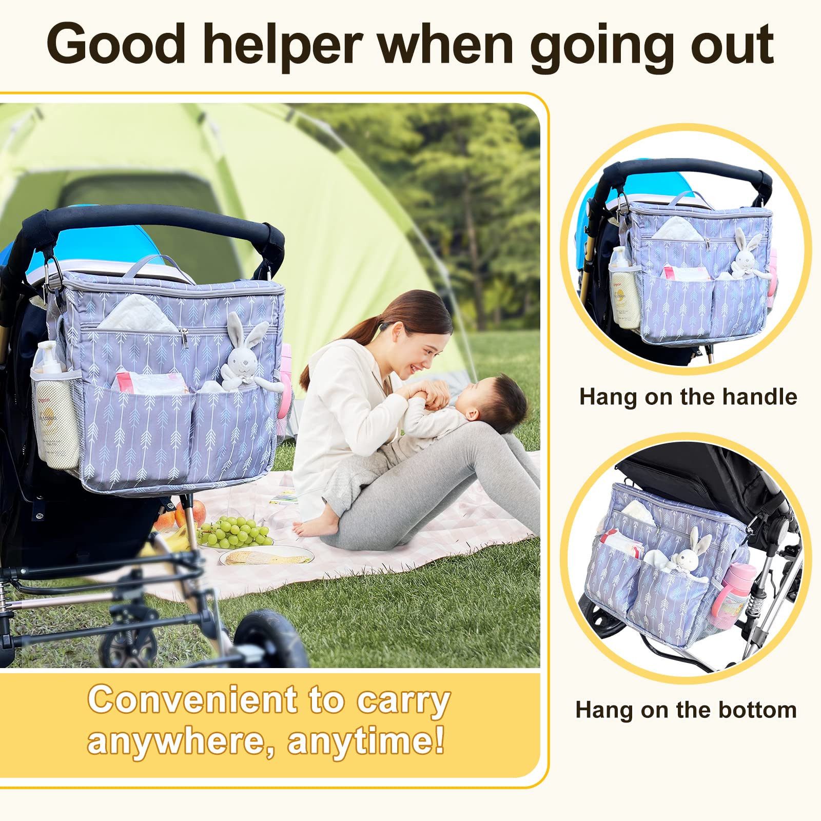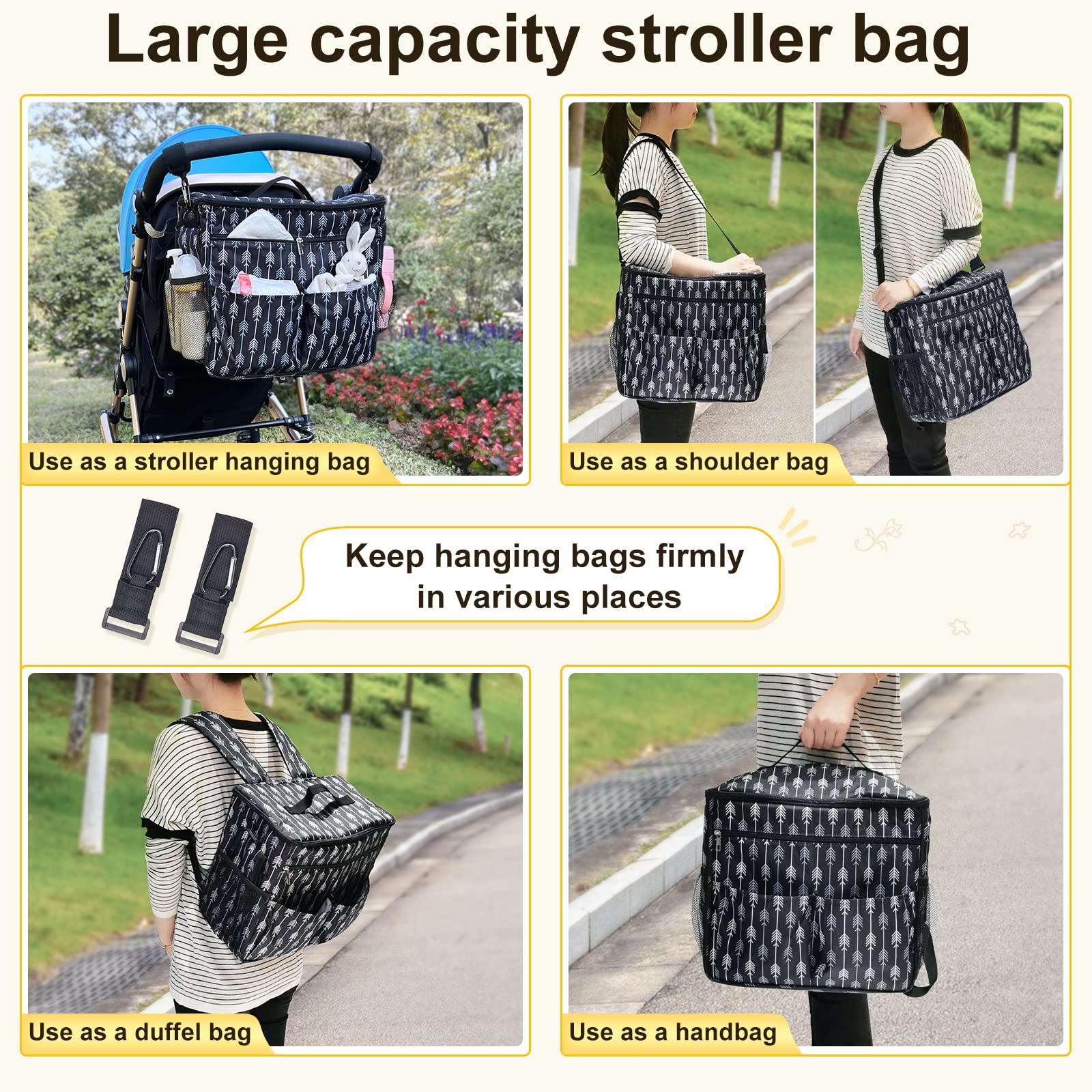 - [Multiple scenarios]The stroller diaper bag organizer is designed with adjustable velcro straps as well as a sturdy aluminum hiking buckle hook that can be attached to the handle of most pushchairs or under the seat, ensuring both ease of installation and durability. The stroller caddy can be carried by hand, or converted into a single or double shoulder bag by adjusting the strap. The bag's spacious capacity also makes it perfect for picnics, family camping trips, and other outings.
