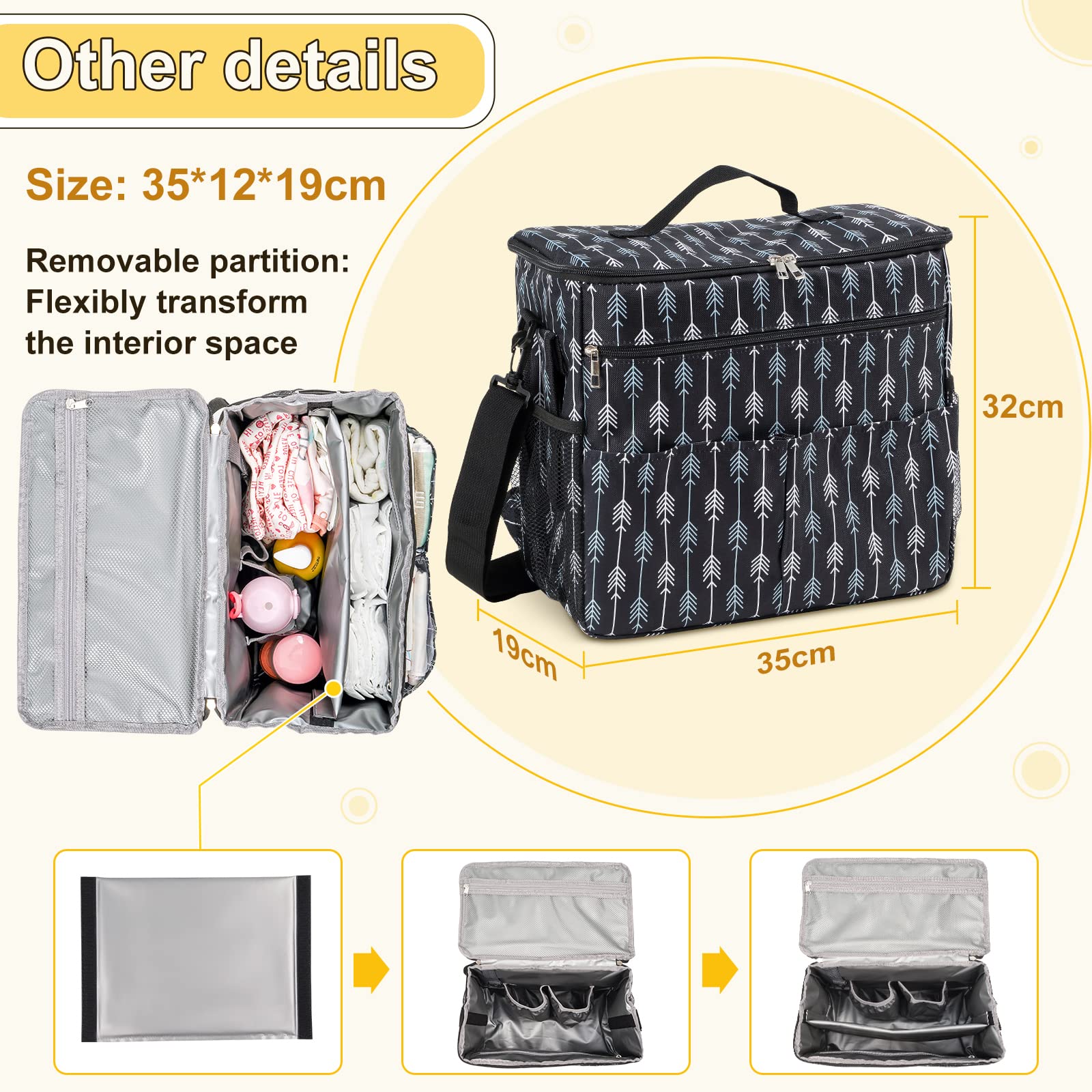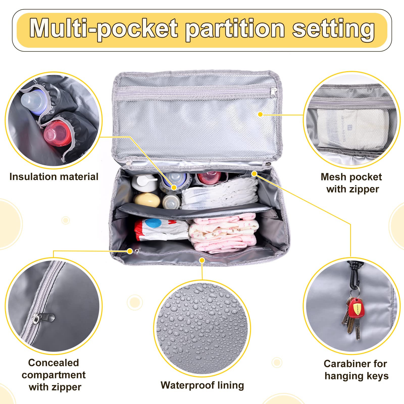 - [Large internal capacity]The interior of the baby stroller organizer is equipped with a removable divider that can be fitted to suit your needs. The top lid comes with a mesh pocket for masks, gauze and other items that may get wet. The insulated bottle bags are attached to the side for keeping bottles warm and cold. The water-resistant zipped pocket can hold your your wallet, cell phone and other essential items.There is even a key lanyard inside for easy access to your keys.