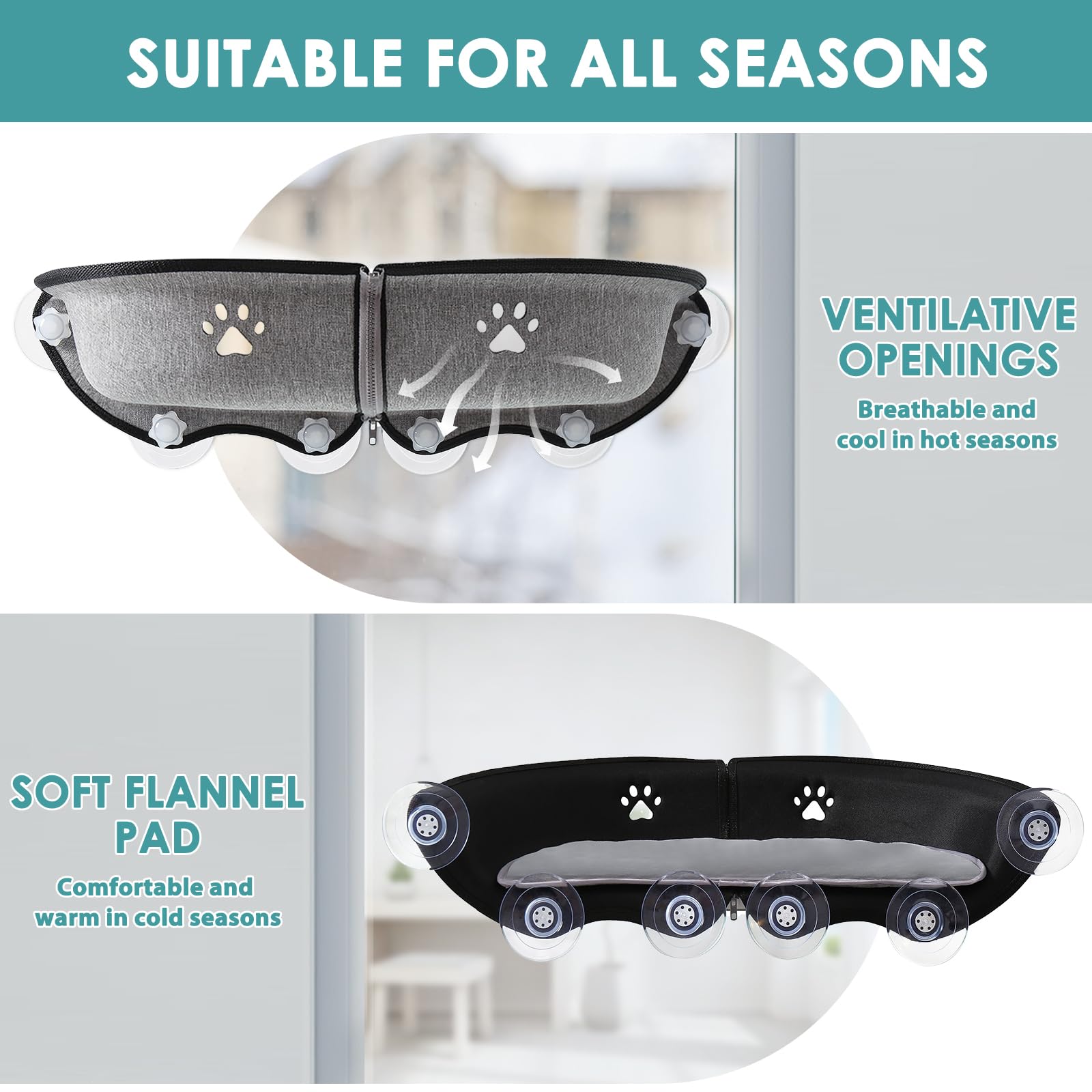- 【Suitable for all seasons】 The main body of our cat window seat is made of cationic fabric plus EVA and polyester woven fabric. It is scratch-resistant and not easy to stick to hair.The two cute cat paw-shaped openings in the front increase ventilation, keeping your cat cool and comfortable during hot seasons. The cat hammock window also comes with a soft flannel cushion, ensuring extra warmth and coziness in colder months.
