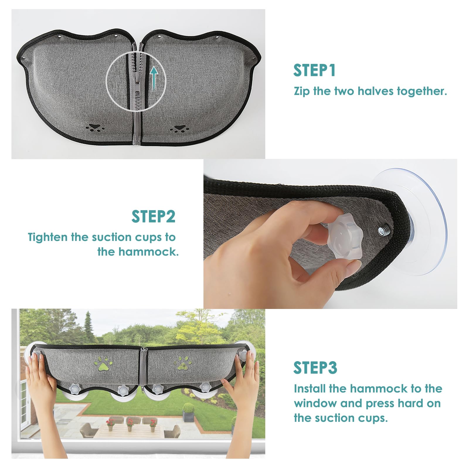 - 【Easy Installation】In just three simple steps, your cat can enjoy its new cat perch: zip it up, tighten the suction cups, and attach it to the window! Before installation, make sure to clean the window and soak the suction cups in warm water (60~80°C) for 3-5 minutes. If you have any questions or suggestions, please don't hesitate to contact us.