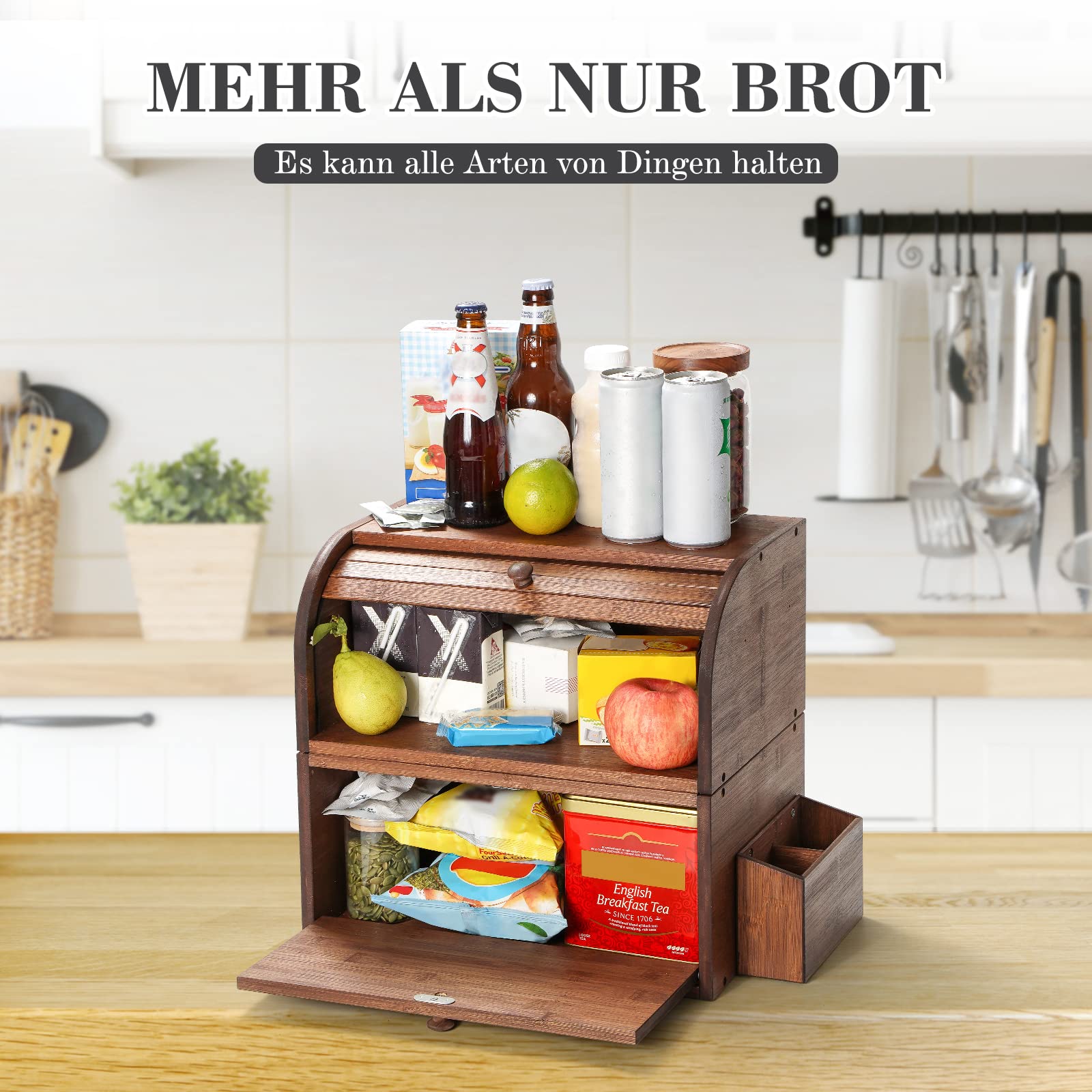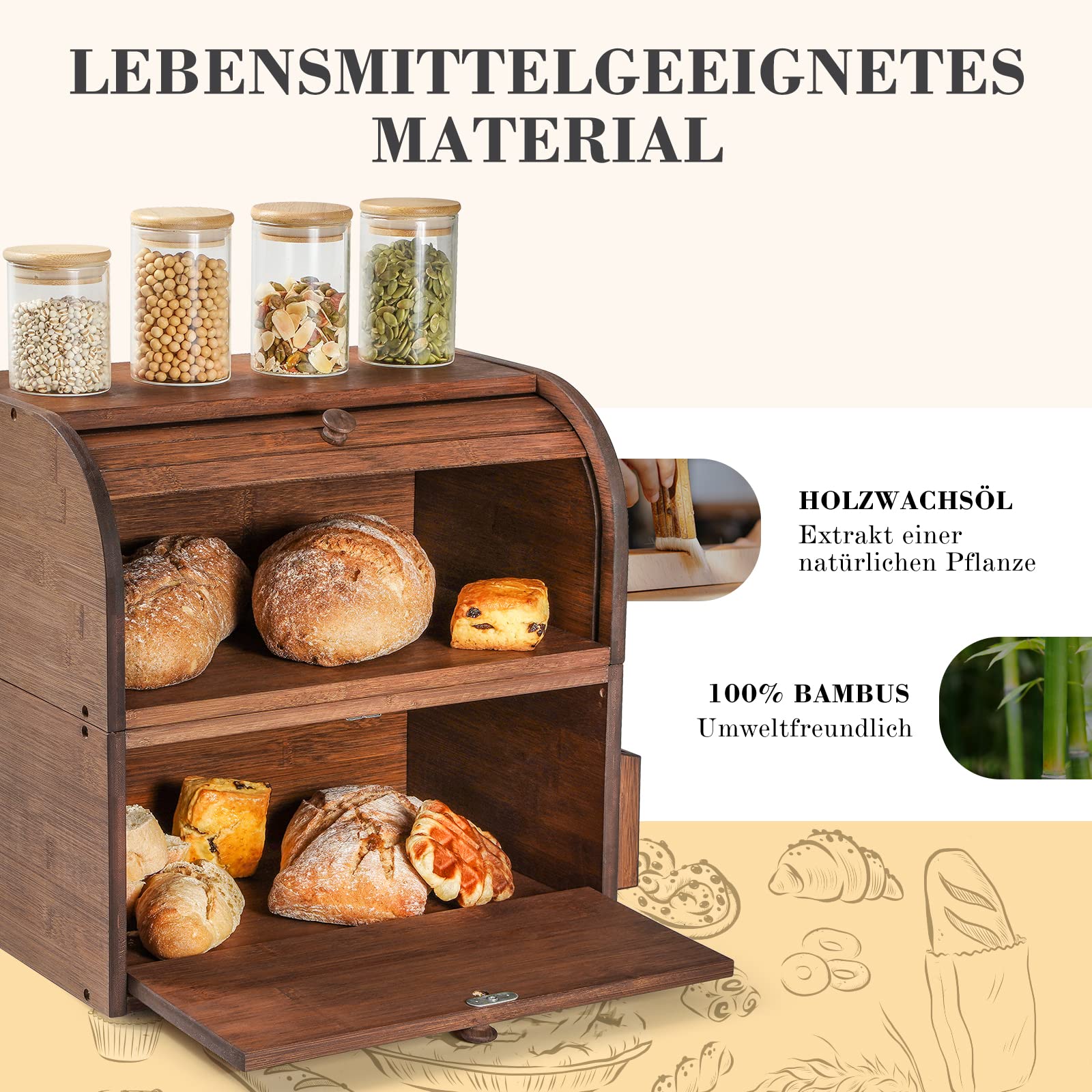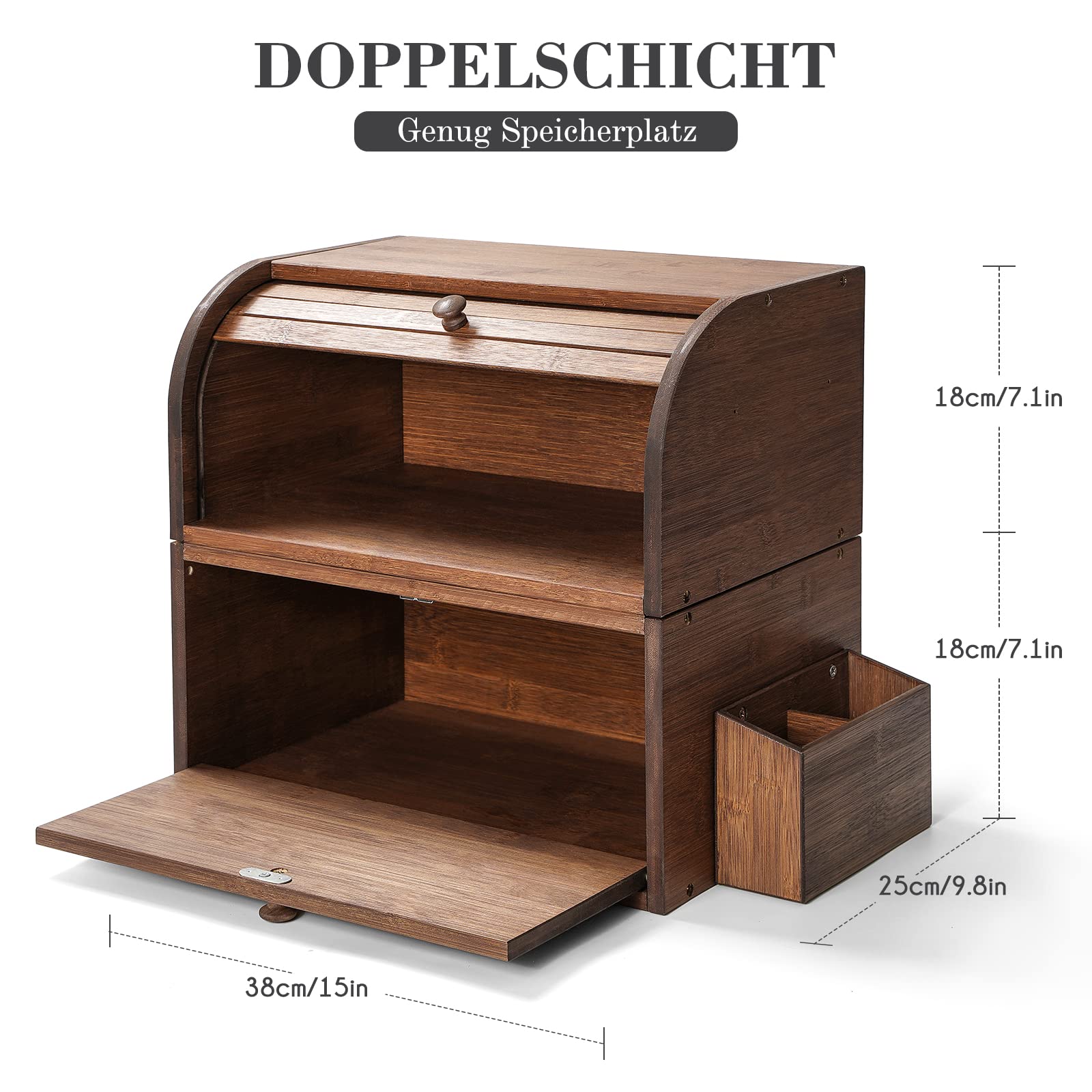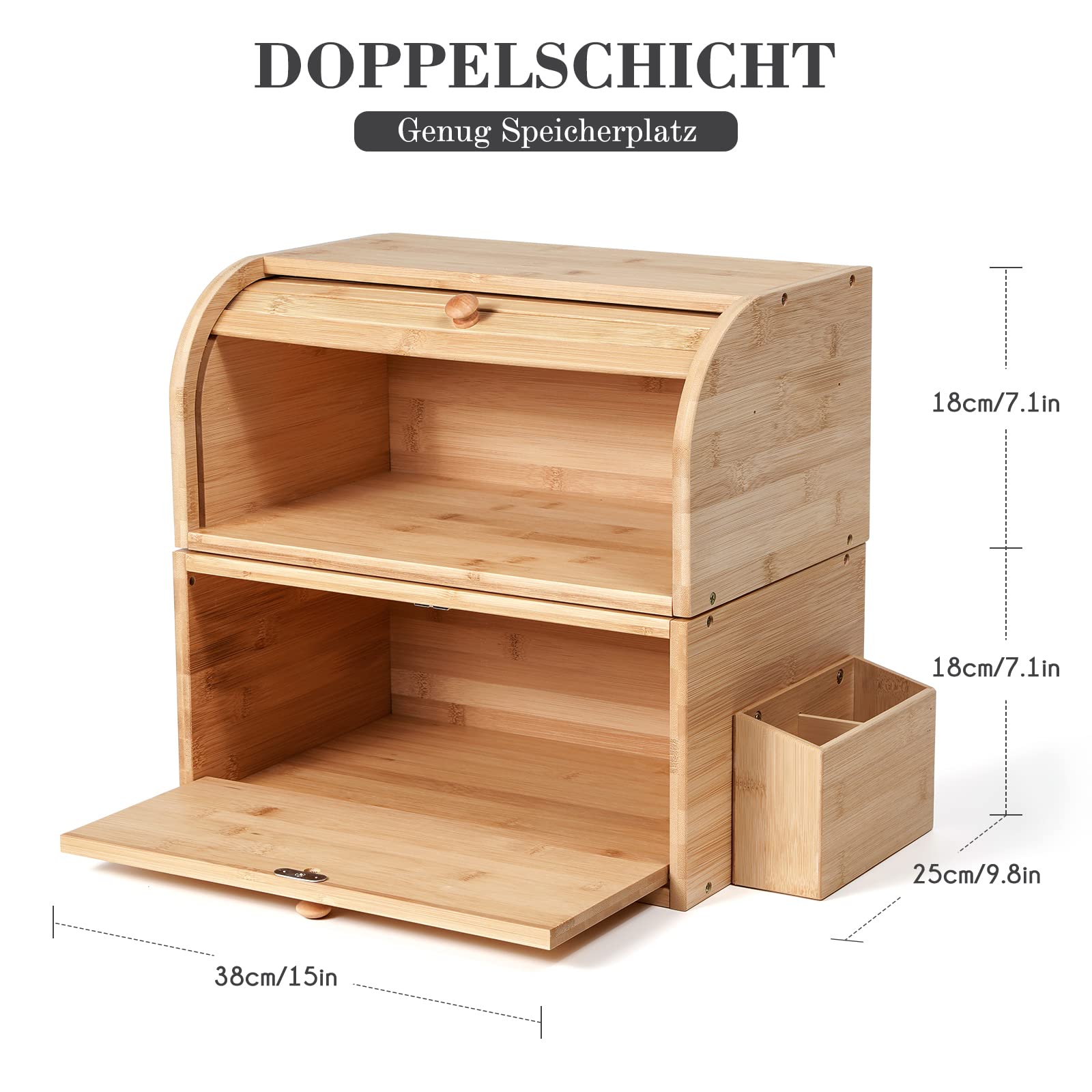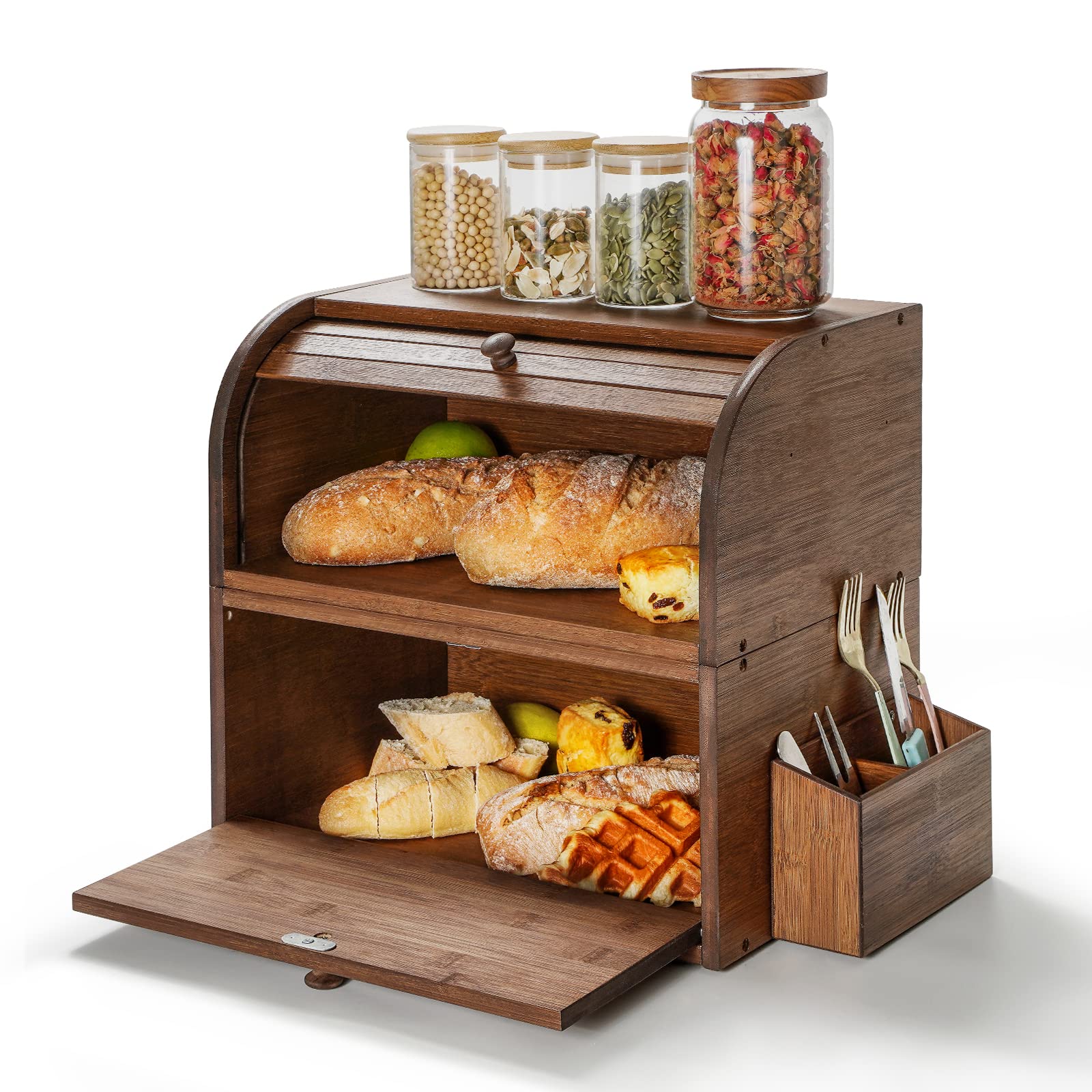 GUUSII HOME Bread Box Wood Bamboo Large Retro Eco Bread Box Rolling Lid Bread Storage Size 38x25x36cm Double Layer Stackable Bread Boxes Matt Natural Bread Box for Keeping Fresh and Delicious Bread