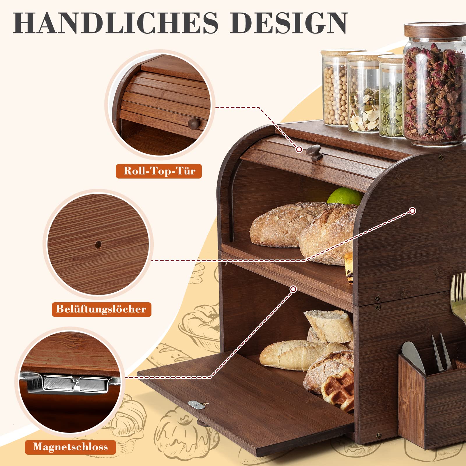【User-friendly design】The upper part of the bread bin is specially designed with a space-saving rolling door. The bottom part is equipped with a magnetic door, which is super easy to open and close. The ventilation holes on bamboo boards can drain excess moisture and maintain proper humidity, so your bread will stay fresh longer
